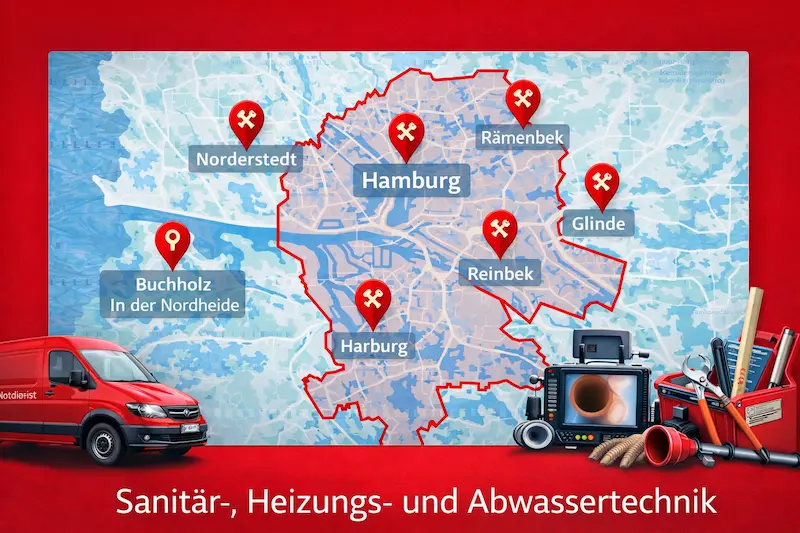 Der Sanitär Notdienst hat mehrere Einsatzgebiete in Hamburg. Mit einer schnellen und kostengünstigen Anfahrt.